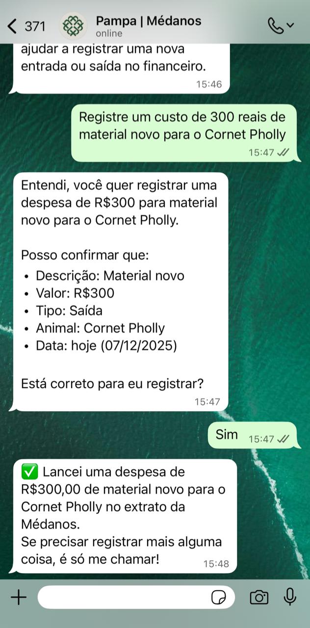 Conectamos WhatsApp e Médanos em um fluxo único: entradas ou saídas financeiras viram informações organizadas na plataforma.