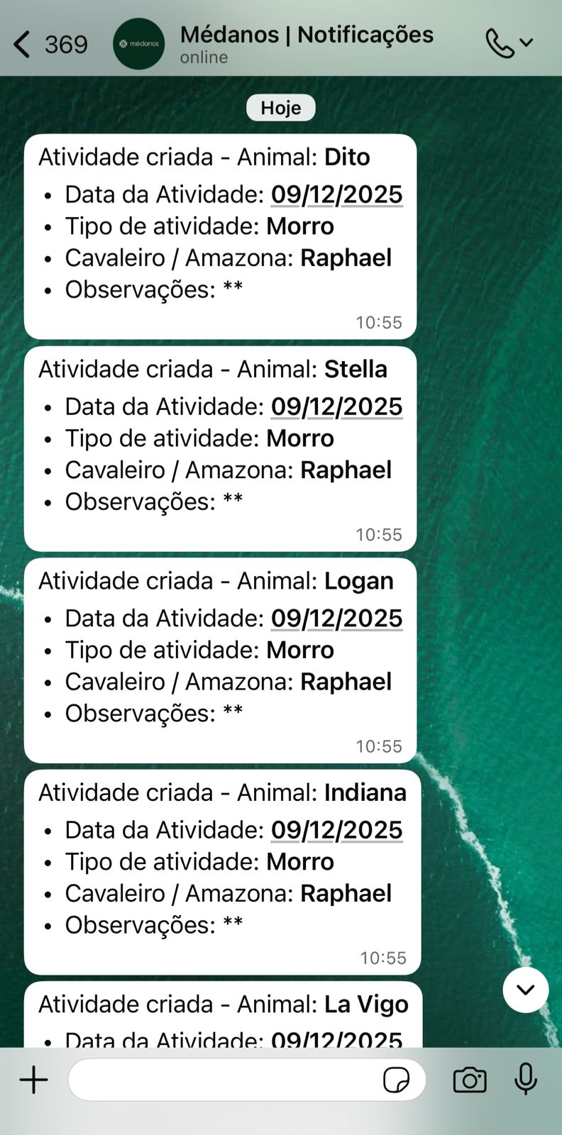 Os responsáveis pelas atividades recebem mensagens no WhatsApp com detalhes que você mesmo define.
